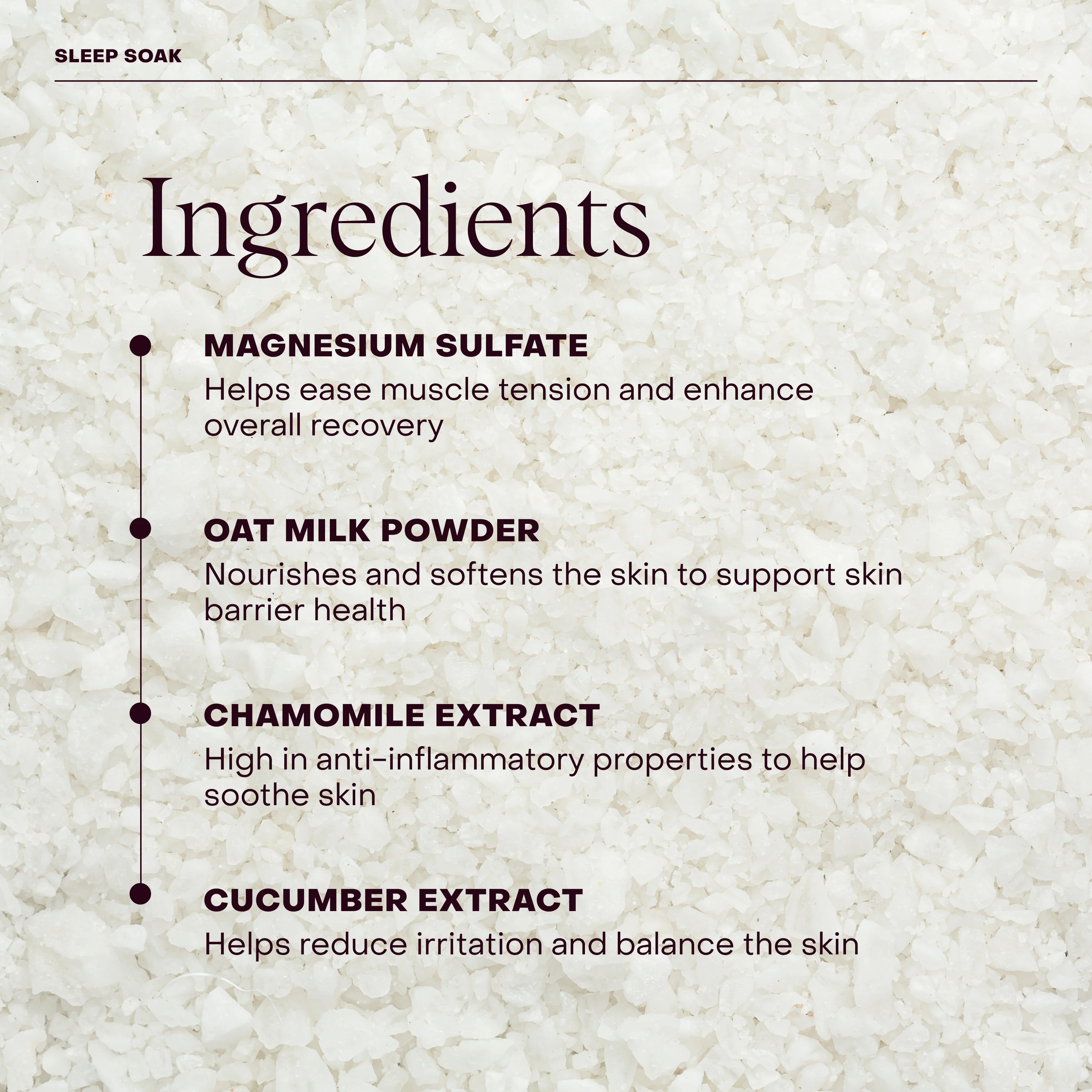 Sleep Soak is a deeply calming magnesium and chamomile bath soak to help soothe, disconnect and support restful sleep.