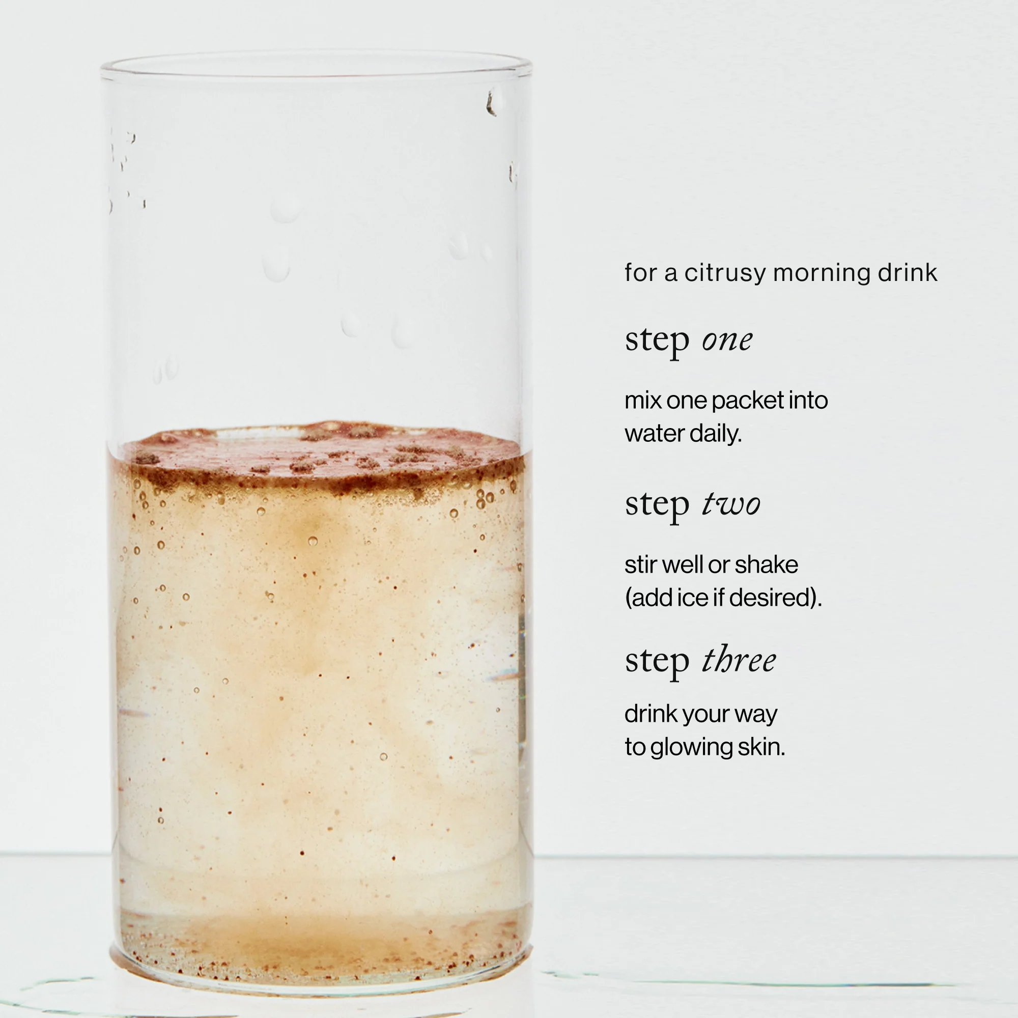 WHAT IT DOES: When mixed with liquid, it provides a beneficial dose of vitamins and antioxidants to help fortify your insides and protect your skin from external stressors.